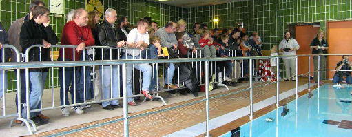 ![]() Der Besucherstrom hielt sich am heutigen Samstag in Grenzen, da in Nürnberg eine Demo gegen Hartz 4 und auch noch ein Club-Heimspiel angesagt war. Wie ich erfuhr, hat der Club 4:0 gegen Tabellenführer Wolfsburg gewonnen. Trotzdem kamen wieder viele Fragen zu den Modellen. Mit einer weiteren Vorführung gegen 13:30 Uhr war vom offiziellen Teil alles erledigt. Kleinere Schäden bei den ganz kleinen Modellen gab es ein paar, da in dem Schwimmbad doch recht viele Störquellen vorhanden sind, die einen einwandfreien Betrieb aufgrund der engen Anordnung der einzelnen elektronischen Bauteile (noch) nicht zu beseitigen sind. Gegen 16 Uhr war freies Fahren angesagt. Hier wurde ein riesen U-Boot ins Wasser gesetzt. Auch dieses beeindruckte gewaltig das Publikum, konnte es doch auf der Stelle tauchen oder exakt die voreingestellte Tiefe halten. Der Erbauer Markus Rieger, ein Freund und immer wieder gern gesehener Gast unseres Vereins, war bei dieser Vorführung sichtlich Stolz auf sein Meisterwerk. Und dazu hat er auch allen Grund! Kleine Anmerkung: Im Herbst 2005 findet unser Internationales U-Boot-Treffen statt, dort kann die Leistung dieses tollen U-Bootes in voller Fahrt bestaunt werden.