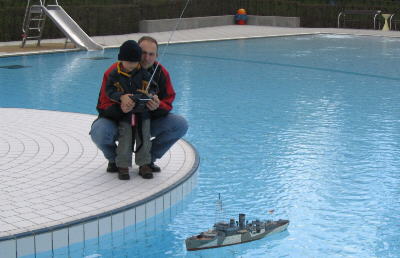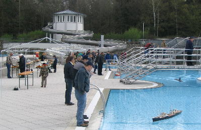 Aber Glück im Unglück: Im schönen Markt Feucht gibt es das "Feuchtasia", ein sehr schönes Waldbad im Grünen, mit tollen Becken, und man hat sich auch über unsere Veranstaltung gefreut und viel Mühe gemacht, um alles für uns vorzubereiten. Gleich vorneweg ein dickes Lob und vielen Dank für die hervorragende Organisation der Marktgemeinde Feucht. Nix wissen ist auch was, aber es wäre toll, wenn dieses Bad in Zukunft auch weiterhin für unsere U-Boot-Treffen zur Verfügung stehen würde. Wer unsere Info-Hefte aufmerksam liest weiß, dass der SMC Nürnberg so seine kleinen Probleme mit dem "Wettergott" hat. Diesmal hat er es aber wirklich krachen lassen. Das Absolute Highlight in der SMC-Geschichte: 6 Grad plus! Es waren Stimmen zu hören wie "Muß die Veranstaltung im Februar durchgezogen werden?" oder "Fein, dass das Eis schon abgetaut ist...." Also, der Wärmeraum war am besten besucht! Da täuschen auch die schönen Bilder mit dem blauen Himmel nicht darüber weg! Trotzdem: Alle haben dem Wetter getrotzt und ihre Boote zu Wasser gelassen. Und es war einfach schön anzusehen, wie die Boote ihre Runden zogen und doch dem Publikum einiges an spektakulären Vorführungen bieten konnten. Vertreten waren alle Arten von Tauchbooten im zivilen wie auch militärischen Bereich, dynamisch und statisch tauchend. Bei den letztgenannten gab es welche mit Kolbentank- und Pressluftsystem. Diese waren natürlich besonders im Blickpunkt der leider, wetterbedingt, wenigen Zuschauer. Auch die Akteure waren begeistert, die ersten (Lob und Danke) Mails haben wir bereits erhalten. Hatten Sie doch kleine "Brücken" in den einzelnen Becken, und dies war natürlich von Vorteil, da man von oben bestens steuern konnte. Auch ich steuerte meine dynamisch tauchende U 50 von solch einem Steg, hatte aber trotzdem manchmal schlechte Sicht, da mein lieber Kollege Matthias mit seinem breiten Kreuz im Weg stand, vor allem, wenn ich unter einer Brücke durchfahren wollte. Und dynamisch tauchende Boote brauchen nun mal ein gewisses Tempo, damit sie schön unten bleiben. Aber dies nur als kleine Randbemerkung. Durch die durchdachte Aufteilung der Becken konnte jeder nach seinen Vorstellungen fahren, große wie auch kleine Boote, da durch die künstlichen Inseln die Wellen von den großen Booten so gebrochen wurden, dass auch die kleinen unbeschadet ihre Runden drehen konnten. Die Ausstellung ging über zwei Tage, der erste, ausschließlich für U-Boote, wurde mit einem zünftigen Beisammensein in einem griechischen Lokal beendet. Da diesem auch ein Hotel angegliedert war hatten die auswärtigen Aussteller einen klaren Vorteil gegenüber dem Gastgeber, also dem SMC Nürnberg. Nun, wir haben es verkraftet und halt mehr gegessen... Apropos Essen: Auch in diesem Bad gab es eine hervorragende und freundliche Bewirtung mit großer Auswahl an Speisen und Getränken. Durch die Kälte bedingt dürften überwiegend heiße Getränke am besten gegangen sein, da alles im Freien stattfand. Die Gaststätte ist zwar überdacht, aber eben doch nicht Windgeschützt. Ich habe mir vorgenommen, bei meinem nächsten Besuch als Badegast die Küche zu testen.