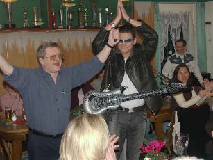 Danach die übliche Geschenkverteilung mit Verlosung und dann der Höhepunkt des Abends: Rudi und Ingo als Rocker! Ich muß sagen, die Beiden haben’s prima gemacht. Wenn ich nur wüßte, wer imitiert worden ist! Die Soundanlage hat nämlich schlapp gemacht. War aber kein Problem, der Beifall war trotzdem gigantisch.