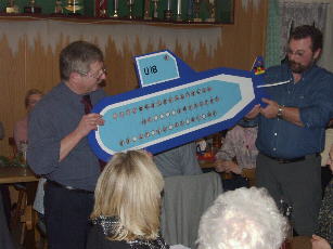 Dann kam Sigried Brütting aus Bayreuth mit einem besonderen Geburtstagsgeschenk: Ein U-Boot, blau, mit allen Clubmitgliedern hinter den Bullaugen. Danach wurden Stefan und Harald für besondere Verdienste geehrt, mit Sekt.