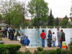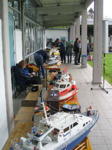 Eröffnungsfahren 2005 -- Rückblick Bericht und Fotos: Klaus Müller Fast schon gewohnheitsmäßig fing unsere erste Veranstaltung ziemlich naß an. Wir lieben ja alle das feuchte Element, aber bitte als See oder Bad! Na ja, der Himmel hatte kein Einsehen mit uns und ließ es bis Mittag richtig kräftig regnen. Gut 100 ausgestellte Modelle warteten auf ihren Einsatz! Herr Wilhelm Schäfer, unser 2. Vorstand der für diese Veranstaltung verantwortlich ist, lief dementsprechend herum. Er konnte einem richtig Leid tun! Glück für unsere Ausstellung war eine kleine (Landwirtschaft) Messe direkt neben dem Limesbad. Dank dieser Besucher verirrten sich etliche auch zu uns, und so kann man den heutigen Tag auch als einen Erfolg für unsere Besucherzahlen werten. Wegen des Regens gab es vormittags keine Rangeleien wegen der Frequenzen, es fuhr ja nichts. Ab und zu sah man den Einen oder Anderen dem Wetter trotzen, aber lang hielt es keiner am Becken durch. Ab 13:00 Uhr lichteten sich die Wolken und der Regen verebbte. Sofort begann ein Run auf die Frequenzklammern und null Komma nichts waren alle drei Becken des Limesbades von Schiffsmodellen befahren. Für die jetzt zahlreichen Besucher bot sich ein interessantes Bild, es war schön anzusehen, wie kleine und große Modelle mehr oder weniger imposant ihre Runden drehten. Auch ich setzte meinen "Sea Commander" ein und brachte das gemütliche dahingleiten der anderen mit meinem schnellen Boot gehörig durcheinander. Die U-Boot-Fraktion wird ja auch immer größer, allerdings waren heute nur sehr wenige vertreten. Eines der U-Boote machte seinem Namen alle Ehre, es blieb nach dem Tauchgang einfach unten. Die Bergung war nicht besonders schwer, allerdings dürfte da wohl die gesamte Elektronik im wahrsten Sinne des Wortes baden gegangen sein. Ein zentraler Anlaufpunkt war wieder mal das Cafe im Bad. Die Verköstigung war wie immer gut. Der Nachmittag blieb sonnig und sorgte für ununterbrochenen Fahrbetrieb bis zum Ende der Veranstaltung. Keiner hatte mit so einer Wetterbesserung gerechnet. Etliche der Aussteller fuhren danach zum Araunerskeller und ließen den Tag bei Speis' und Trank gemütlich ausklingen. Fazit: Trotz Wetterwidrigkeiten war es wieder einmal ein gelungener Auftakt. Mal sehen, ob die anderen Veranstaltungen auch so feucht beginnen werden! |