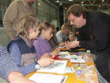 Etwas ganz Tolles hat Alf noch auf die Beine gestellt: Nachwuchsförderung! Hat er doch extra für die Kinder und Jugendlichen unter den Besuchern Tische mit Bausätzen, Klebern, Cuttermessern usw. aufgestellt und diese basteln lassen. Er hat es sich nicht nehmen lassen, dabei auch selbst Hand anzulegen. Und seine freundlichen Mitstreiter haben aufgepasst, dass Pflaster und tröstende Worte jederzeit parat waren. Wie die Fotos zeigen, waren alle eifrig bei der Sache und es hat ihnen sichtlich viel Spaß bereitet.