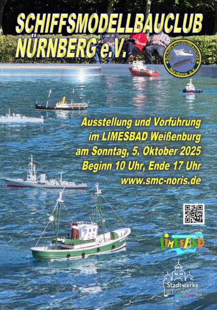 RÜCKBLICK > SMC-Ausflug > Schwarzachtalseen > 09. 2025 RÜCKBLICK > Season Closing Event > Waldbad Neustadt/Aisch > 21. 09. 2025 Modellschiff-Treff > "Kunomare" Burgkunstadt > Freitag > 03. 10. 2025 SMC Schaufahren > "Limesbad" Weißenburg > Sonntag > 05. 10. 2025 SMC Vereinsmeisterschaft 2025 > ... geplant > xx. 10. 2025 SMC Club-Abend > Jahreshauptversammlung > Freitag > 17. 10. 2025 U17 ( Typ 206A ) > im Heimathafen > Technik Museum Sinsheim