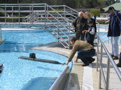 Aber Glück im Unglück: Im schönen Markt Feucht gibt es das "Feuchtasia", ein sehr schönes Waldbad im Grünen, mit tollen Becken, und man hat sich auch über unsere Veranstaltung gefreut und viel Mühe gemacht, um alles für uns vorzubereiten. Gleich vorneweg ein dickes Lob und vielen Dank für die hervorragende Organisation der Marktgemeinde Feucht. Nix wissen ist auch was, aber es wäre toll, wenn dieses Bad in Zukunft auch weiterhin für unsere U-Boot-Treffen zur Verfügung stehen würde. Wer unsere Info-Hefte aufmerksam liest weiß, dass der SMC Nürnberg so seine kleinen Probleme mit dem "Wettergott" hat. Diesmal hat er es aber wirklich krachen lassen. Das Absolute Highlight in der SMC-Geschichte: 6 Grad plus! Es waren Stimmen zu hören wie "Muß die Veranstaltung im Februar durchgezogen werden?" oder "Fein, dass das Eis schon abgetaut ist...." Also, der Wärmeraum war am besten besucht! Da täuschen auch die schönen Bilder mit dem blauen Himmel nicht darüber weg! Trotzdem: Alle haben dem Wetter getrotzt und ihre Boote zu Wasser gelassen. Und es war einfach schön anzusehen, wie die Boote ihre Runden zogen und doch dem Publikum einiges an spektakulären Vorführungen bieten konnten. Vertreten waren alle Arten von Tauchbooten im zivilen wie auch militärischen Bereich, dynamisch und statisch tauchend. Bei den letztgenannten gab es welche mit Kolbentank- und Pressluftsystem. Diese waren natürlich besonders im Blickpunkt der leider, wetterbedingt, wenigen Zuschauer. Auch die Akteure waren begeistert, die ersten (Lob und Danke) Mails haben wir bereits erhalten. Hatten Sie doch kleine "Brücken" in den einzelnen Becken, und dies war natürlich von Vorteil, da man von oben bestens steuern konnte. Auch ich steuerte meine dynamisch tauchende U 50 von solch einem Steg, hatte aber trotzdem manchmal schlechte Sicht, da mein lieber Kollege Matthias mit seinem breiten Kreuz im Weg stand, vor allem, wenn ich unter einer Brücke durchfahren wollte. Und dynamisch tauchende Boote brauchen nun mal ein gewisses Tempo, damit sie schön unten bleiben. Aber dies nur als kleine Randbemerkung. Durch die durchdachte Aufteilung der Becken konnte jeder nach seinen Vorstellungen fahren, große wie auch kleine Boote, da durch die künstlichen Inseln die Wellen von den großen Booten so gebrochen wurden, dass auch die kleinen unbeschadet ihre Runden drehen konnten. Die Ausstellung ging über zwei Tage, der erste, ausschließlich für U-Boote, wurde mit einem zünftigen Beisammensein in einem griechischen Lokal beendet. Da diesem auch ein Hotel angegliedert war hatten die auswärtigen Aussteller einen klaren Vorteil gegenüber dem Gastgeber, also dem SMC Nürnberg. Nun, wir haben es verkraftet und halt mehr gegessen... Apropos Essen: Auch in diesem Bad gab es eine hervorragende und freundliche Bewirtung mit großer Auswahl an Speisen und Getränken. Durch die Kälte bedingt dürften überwiegend heiße Getränke am besten gegangen sein, da alles im Freien stattfand. Die Gaststätte ist zwar überdacht, aber eben doch nicht Windgeschützt. Ich habe mir vorgenommen, bei meinem nächsten Besuch als Badegast die Küche zu testen.
