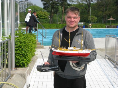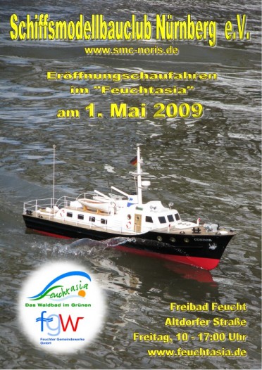 Eröffnungsschaufahren 1. Mai 2009 Bericht/Fotos: kamue Obwohl der eine oder andere Modellschiffkapitän seine Modelle bereits in diesem Jahr ins Wasser setzte, war heute unser Modellschiff-Saisonstart im Feuchtasia Freibad in Feucht.